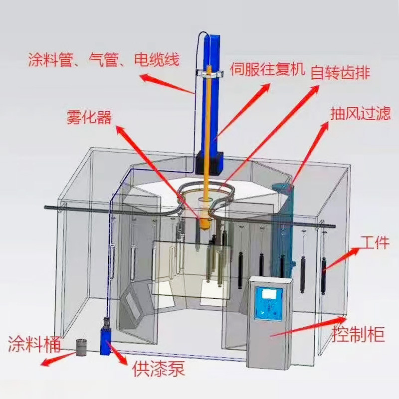 本公司生产的自动喷漆流水线设备具有一次进行多个工件喷涂,喷涂效率高,多重的空气净化系统,工作环境好,工作负荷小,机械自动化操作等显著特点。广泛应用于工件表面的清理,金属的锈蚀层、热处理件表面的残盐和氧化层、轧制件表面的氧化层、锻造件表面的氧化层、焊接件表面的氧化层、铸件表面的型砂及氧化层、机加件表面的残留污物和微小毛刺、旧机件表面等进行处理,以去除表面附着层,显露基体本色。